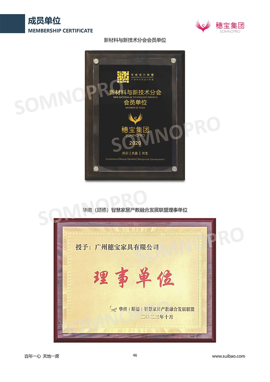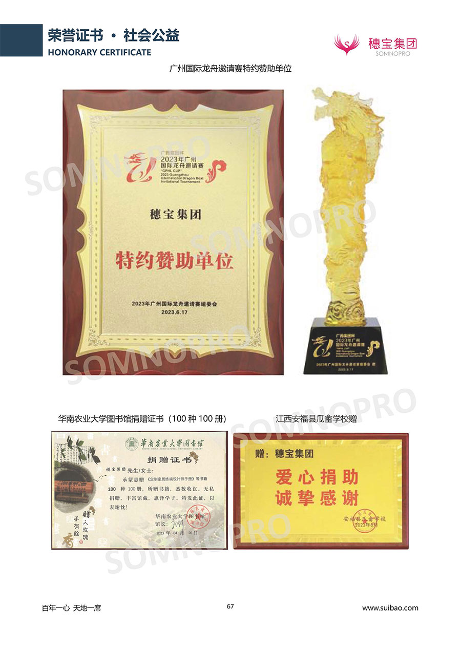 本著高品質(zhì)、高效率、重管理的原則,穗寶已通過ISO9001質(zhì)量管理體系認(rèn)證證書、ISO14001環(huán)境管理體系認(rèn)證證書、ISO45001職業(yè)健康安全管理體系認(rèn)證證書、中國環(huán)境標(biāo)志產(chǎn)品認(rèn)證證書、家居綠色環(huán)保領(lǐng)跑品牌、綠色正品家居品牌、企業(yè)標(biāo)準(zhǔn)“綠色領(lǐng)跑者”證書、CMS測量管理體系證書、CMS測量管理體系證書附件、廣東省“守信用重合同”企業(yè)、廣州歐亞-納稅信用A級納稅人(連續(xù)5年:2018-2022)、2024年中國500最具價值品牌,品牌價值高達(dá)302.89億元、廣東高價值商標(biāo)品牌(穗寶)、廣東省重點商標(biāo)保護(hù)名錄納入證明、廣州市勞動關(guān)系和諧企業(yè)AA級。穗寶自創(chuàng)立以來,不斷致力于新產(chǎn)品的設(shè)計與研發(fā),多次在國內(nèi)家具展會屢獲獎項,產(chǎn)品暢銷國內(nèi)外,深受客戶一致好評。