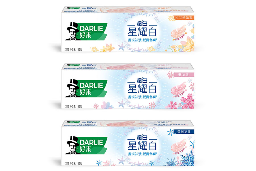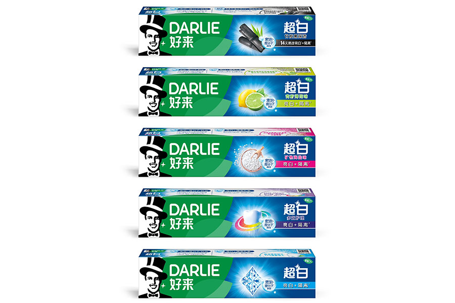 目前DARLIE好來牙膏共有數(shù)十個品種、多種規(guī)格(18g-250g),其中銷往中國大陸市場包括經(jīng)典的雙重薄荷系列、茶倍健系列、超白系列、專研護齦系列、抗敏感系列、透心爽系列,兒童牙膏系列及新增了白.酵素系列和星耀白系列等20個品種,另外還有多個品種同時銷往新加坡、馬來西亞、泰國、中國香港和中國臺灣等市場。