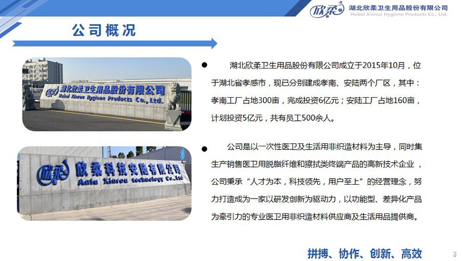欣柔是以一次性醫(yī)衛(wèi)及生活用非織造材料為主導(dǎo),同時(shí)集生產(chǎn)銷售醫(yī)衛(wèi)用脫脂纖維和擦拭類終端產(chǎn)品的高新技術(shù)企業(yè),欣柔秉承“人才為本,科技領(lǐng)先,用戶至上”的經(jīng)營理念,努力打造成為一家以研發(fā)創(chuàng)新為驅(qū)動(dòng)力,以功能型、差異化產(chǎn)品為牽引力的專業(yè)醫(yī)衛(wèi)用非織造材料供應(yīng)商及生活用品提供商。