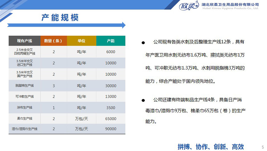 欣柔現(xiàn)有各類水刺及后整理生產(chǎn)線12條,具有年產(chǎn)醫(yī)衛(wèi)用水刺無紡布1.6萬噸、擦拭類無紡布1萬噸、可沖散無紡布1.3萬噸、水刺用脫脂棉3萬噸的能力,綜合產(chǎn)能處于國內(nèi)領(lǐng)先地位。