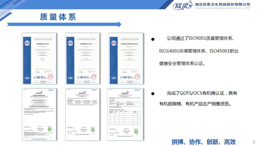 欣柔通過了ISO9001質(zhì)量管理體系、ISO14001環(huán)境管理體系、ISO45001職業(yè)健康安全管理體系認(rèn)證。完成了GOTS/OCS有機(jī)棉認(rèn)證,具有有機(jī)脫脂棉、有機(jī)產(chǎn)品生產(chǎn)銷售資質(zhì)。