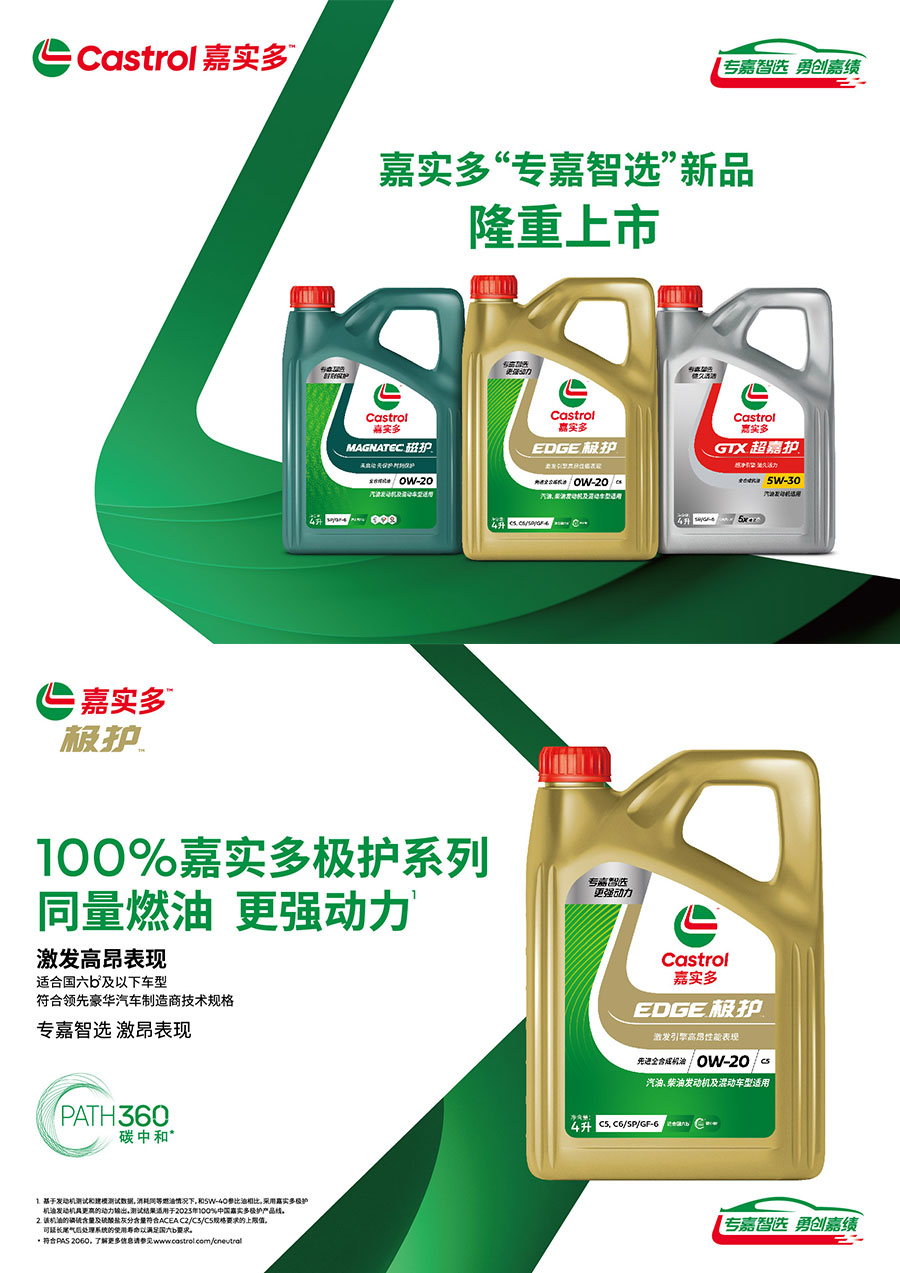 嘉實(shí)多是全球領(lǐng)先的潤(rùn)滑油解決方案供應(yīng)商。121年來(lái),嘉實(shí)多始終是品質(zhì)、科技和環(huán)保的先鋒,獲得了全球億萬(wàn)用戶的信賴。無(wú)論在乘用車、摩托車、還是商用車等領(lǐng)域,嘉實(shí)多都擁有行業(yè)領(lǐng)先的潤(rùn)滑油產(chǎn)品。嘉實(shí)多極護(hù)、嘉實(shí)多磁護(hù)、嘉實(shí)多超嘉護(hù)產(chǎn)品性能全面升級(jí),并且全面適用符合國(guó)六b排放標(biāo)準(zhǔn)的車型。