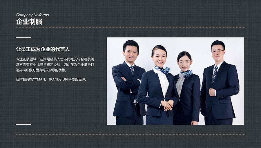 主要產(chǎn)品:TRANDS(創(chuàng)世)高級(jí)男裝品牌,TRANDSUNI、KEYMEN(凱門)高級(jí)職業(yè)裝品牌,KEYMEN KIDS凱門學(xué)生裝等系列服裝服飾