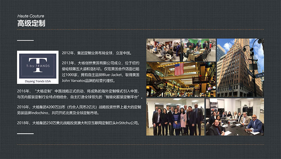 目前,大楊集團(tuán)全球營(yíng)銷網(wǎng)絡(luò)已遍布美國(guó)、加拿大、荷蘭、英國(guó)、澳大利亞及日本等27個(gè)國(guó)家和地區(qū),開設(shè)單裁合作店面上千家,與加拿大互聯(lián)網(wǎng)定制巨頭Indochino公司、澳大利亞知名男裝定制企業(yè)Institchu公司、美國(guó)服裝巨頭TBI公司簽署戰(zhàn)略合作協(xié)議,年定制產(chǎn)品數(shù)量已突破200萬件/套,具備西裝、襯衫、休閑裝以及大衣、風(fēng)衣等全品類定制生產(chǎn)能力。