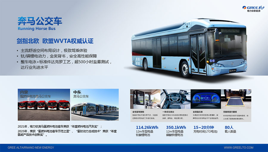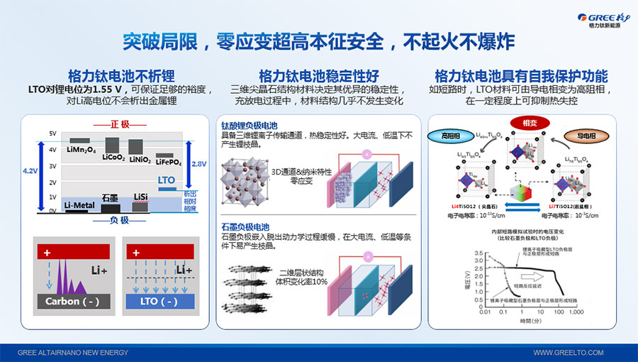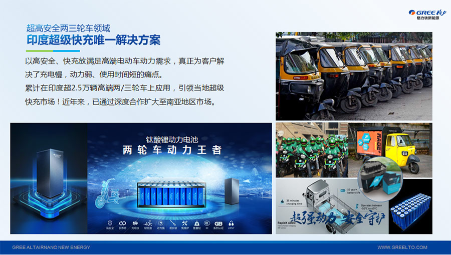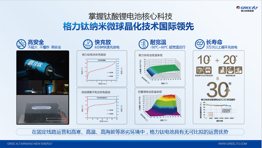 以完善的研發(fā)體系,格力鈦加快技術(shù)創(chuàng)新與產(chǎn)業(yè)升級的步伐。格力鈦研發(fā)的格力鈦電池安全性長期領(lǐng)跑行業(yè),憑借具有高安全、大倍率、快充放、耐寬溫、長壽命等特性,被選為“國家制造業(yè)單項冠軍產(chǎn)品”,廣泛應(yīng)用于新能源汽車以及工商業(yè)園區(qū)、通訊基站、電網(wǎng)調(diào)頻、軌道交通、風(fēng)光消納、船舶岸電、家庭住宅、軍事科研等儲能領(lǐng)域,具有廣闊的市場前景和應(yīng)用價值。目前,格力鈦儲能產(chǎn)品已在丹麥、瑞士、芬蘭等全球30多個國家和地區(qū)使用,新能源汽車產(chǎn)品在北京、杭州、武漢、成都、青島、哈爾濱、包頭、海口等全球240多座城市運營,12年全球零電池事故安全運行。