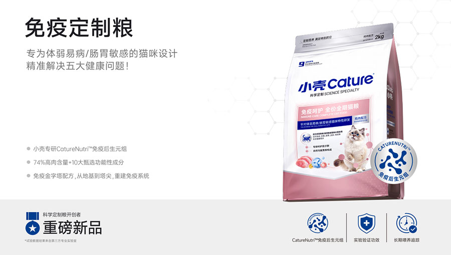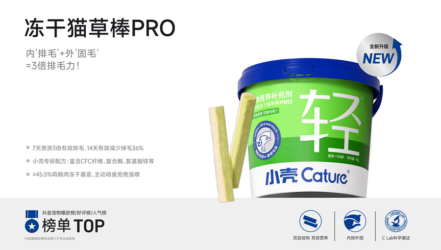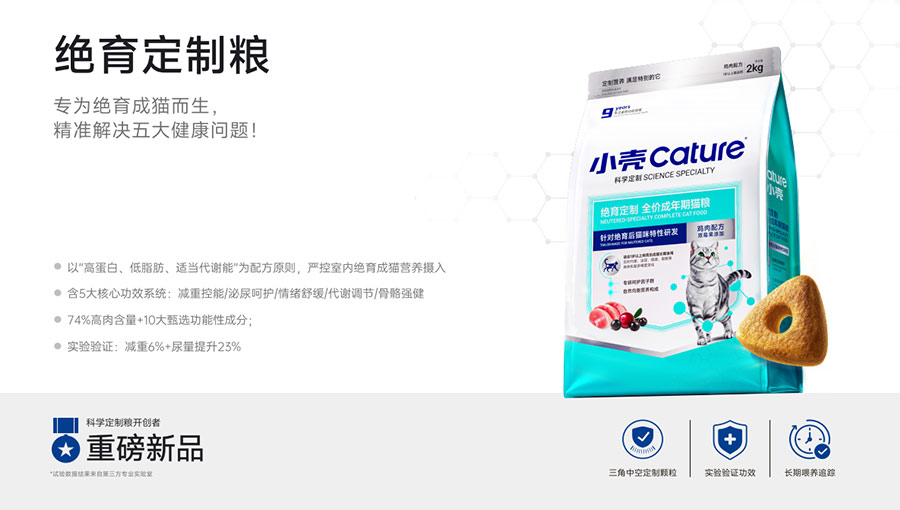 主要產(chǎn)品:小殼絕育定制糧,小殼皮膚毛發(fā)定制糧,小殼免疫呵護(hù)定制糧,小殼功能主食罐系列(小殼排毛主食罐,小殼魚油主食罐),小殼小輕松凍干棒系列(小殼貓草棒pro,小殼魚油棒pro)