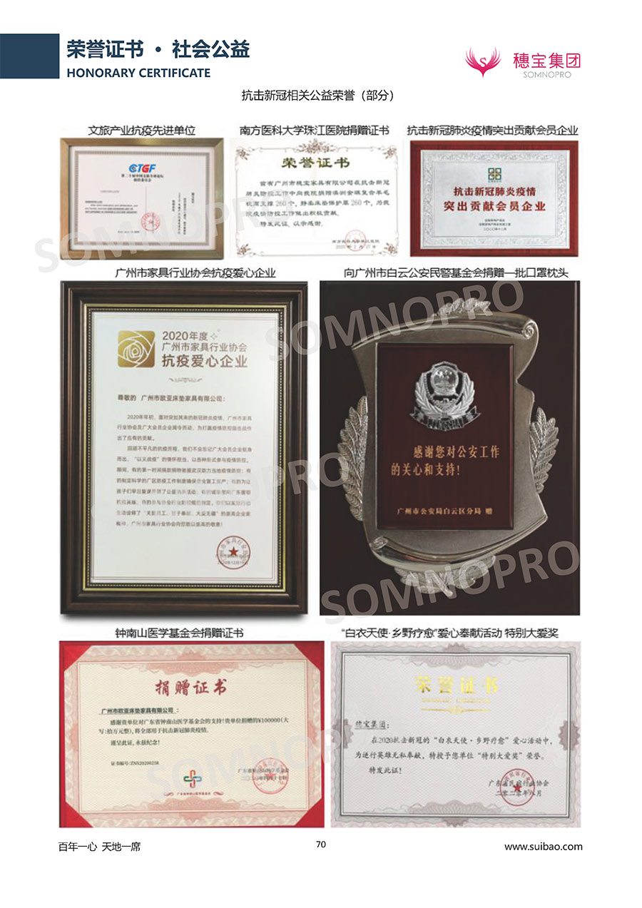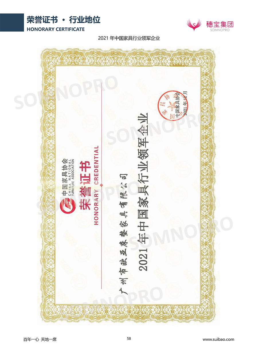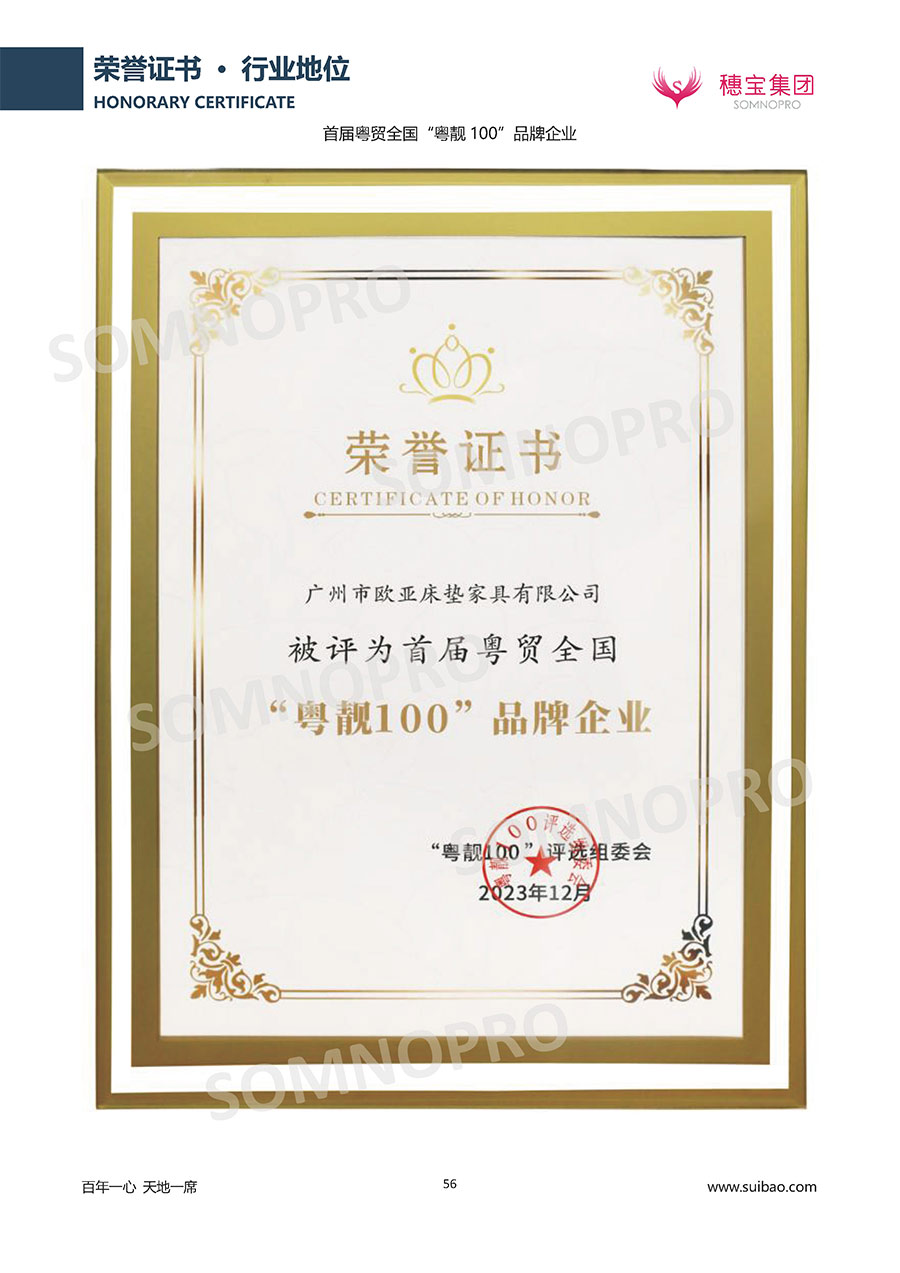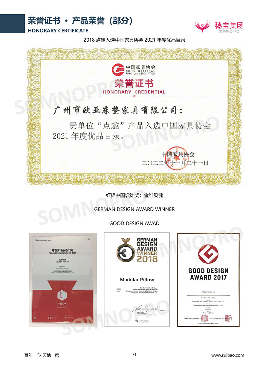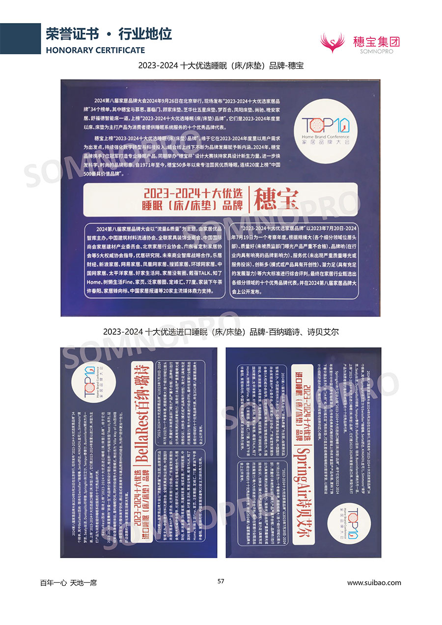 自1971年獨(dú)立研發(fā)生產(chǎn)出專(zhuān)屬?lài)?guó)人的彈簧床墊,穗寶關(guān)于優(yōu)質(zhì)深度睡眠的研究已有半個(gè)世紀(jì)的歷史。穗寶一直專(zhuān)注床墊,專(zhuān)注中國(guó)消費(fèi)者的睡眠研究,針對(duì)中國(guó)人特點(diǎn)進(jìn)行優(yōu)化創(chuàng)新,不斷提升國(guó)人的睡眠體驗(yàn),只為成就每個(gè)晚上8小時(shí)的優(yōu)質(zhì)深度睡眠。憑借不斷革新的研發(fā)科技和深受消費(fèi)者信賴(lài)的產(chǎn)品品質(zhì),穗寶集團(tuán)旗下品牌和產(chǎn)品屢獲國(guó)內(nèi)外大獎(jiǎng),連續(xù)20年榮膺中國(guó)500最具價(jià)值品牌,品牌價(jià)值高達(dá)302.89億元。