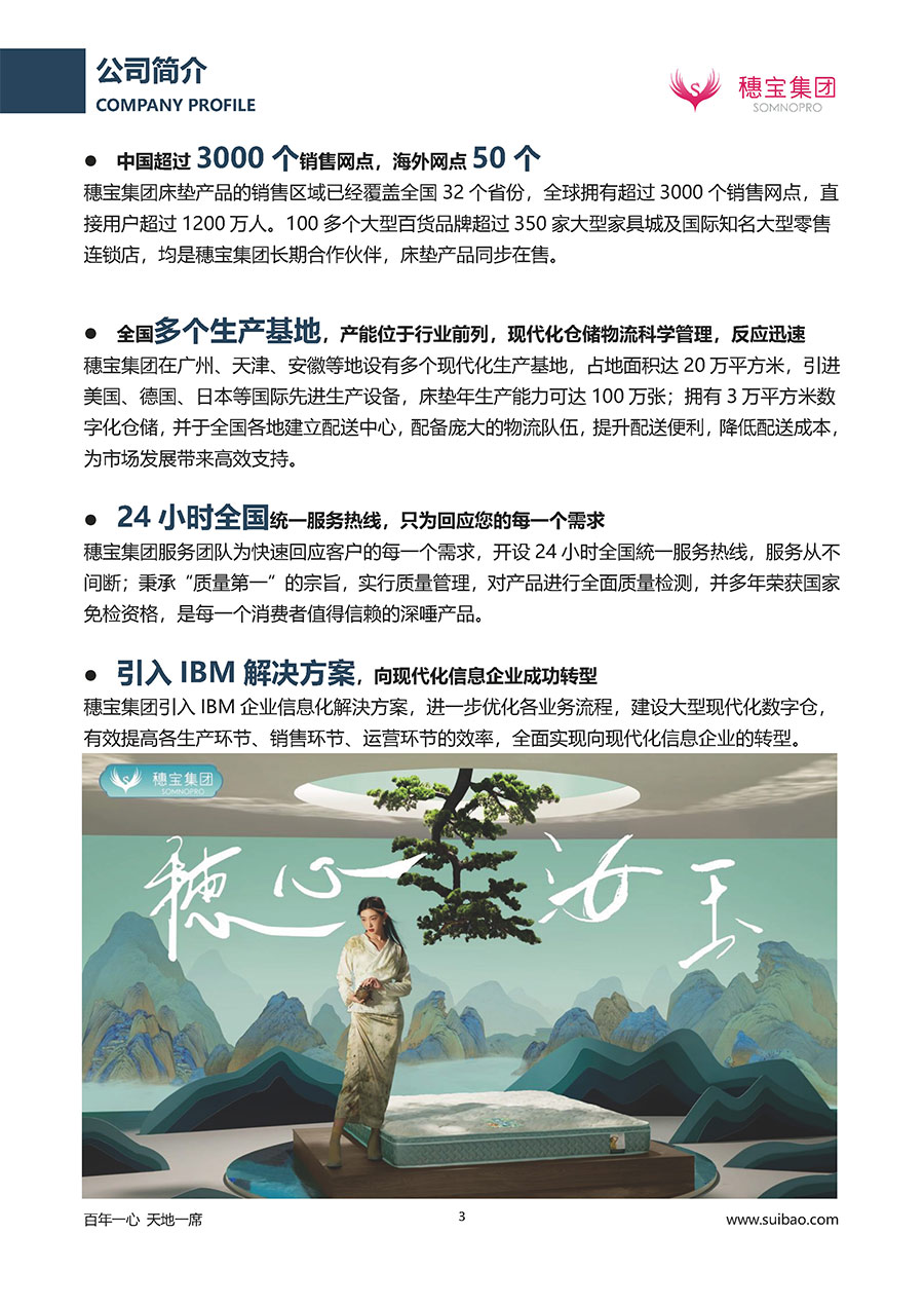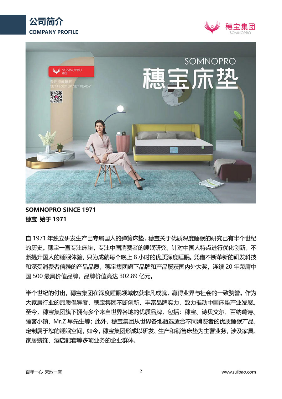 半個(gè)世紀(jì)的付出,穗寶集團(tuán)在深度睡眠領(lǐng)域收獲非凡成就,贏得業(yè)界與社會(huì)的一致贊譽(yù)。作為大家居行業(yè)的品質(zhì)倡導(dǎo)者,穗寶集團(tuán)不斷創(chuàng)新,豐富品牌實(shí)力,致力推動(dòng)中國(guó)床墊產(chǎn)業(yè)發(fā)展。至今,穗寶集團(tuán)旗下?lián)碛卸鄠€(gè)來(lái)自世界各地的優(yōu)質(zhì)品牌,包括:穗寶、詩(shī)貝艾爾、百納璐詩(shī)、睡客小鎮(zhèn)、Mr.Z早先生等;此外,穗寶集團(tuán)從世界各地甄選適合不同消費(fèi)者的優(yōu)質(zhì)睡眠產(chǎn)品,定制屬于您的睡眠空間。如今,穗寶集團(tuán)形成以研發(fā)、生產(chǎn)和銷(xiāo)售床墊為主營(yíng)業(yè)務(wù),涉及家具、家居裝飾、酒店配套等多項(xiàng)業(yè)務(wù)的企業(yè)群體。