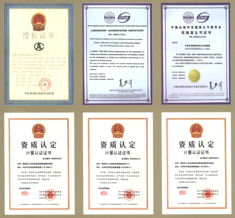 國家地毯質(zhì)量監(jiān)督檢驗中心籌建于1987年,于1988年、1991年相繼通過了國家技術(shù)監(jiān)督局的計量認證考核和審查認可,是國家技術(shù)監(jiān)督局依法授權(quán)的國家級產(chǎn)品質(zhì)量監(jiān)督檢驗機構(gòu)。1999年、2003年和2006年又相繼通過了CNACL、CNAL和CNAS中國合格評定國家認可委員會和國家認證認可監(jiān)督管理委員會對實驗室資格“三合一”的復(fù)查認可和授權(quán)。