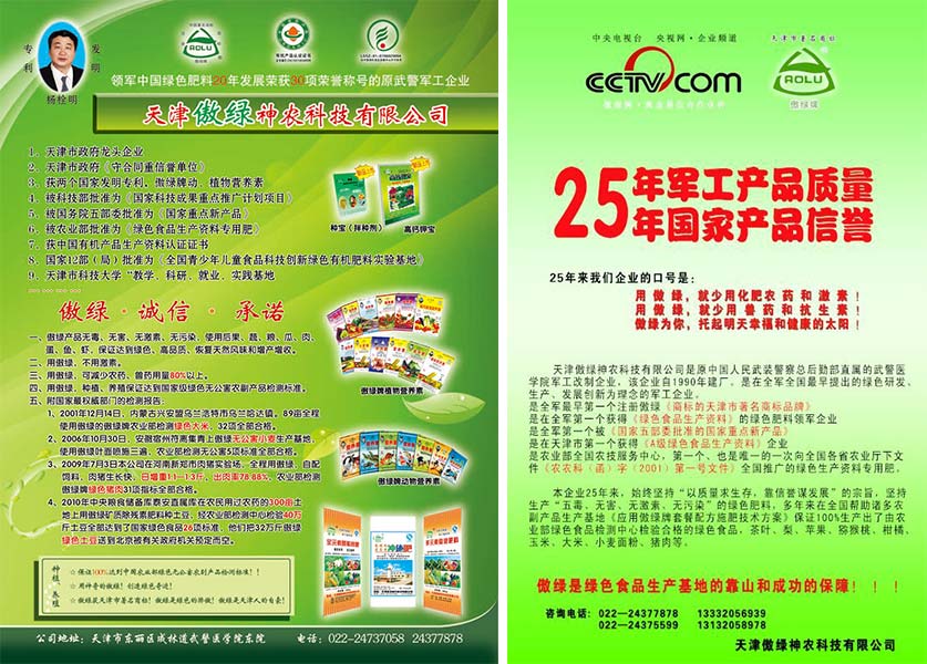 傲綠公司有15年的軍工發(fā)展史和改制后10年的民營市場共計25年的歷程,是專門生產(chǎn)和研發(fā)綠色農(nóng)業(yè)生產(chǎn)資料的高科技企業(yè)實(shí)體。董事長楊栓明先生發(fā)明的傲綠牌動、植物營養(yǎng)素,動、植物礦質(zhì)除殘素獲國家四項(xiàng)發(fā)明專利,曾獲天津市政府頒發(fā)的“科技進(jìn)步獎”、“天津市著名商標(biāo)”,國家科技部頒發(fā)的《科技成果重點(diǎn)推廣計劃指南》證書,國家五部委聯(lián)合頒發(fā)《國家重點(diǎn)新產(chǎn)品》證書,被中國綠色食品發(fā)展中心認(rèn)定為《A級綠色食品生產(chǎn)資料》,被中國科協(xié)授予《全國百項(xiàng)農(nóng)業(yè)精品推薦項(xiàng)目》以及國內(nèi)外博覽會上多項(xiàng)金獎,動物營養(yǎng)素2005年4月被天津市飼料辦批準(zhǔn)為無公害予混合飼料。