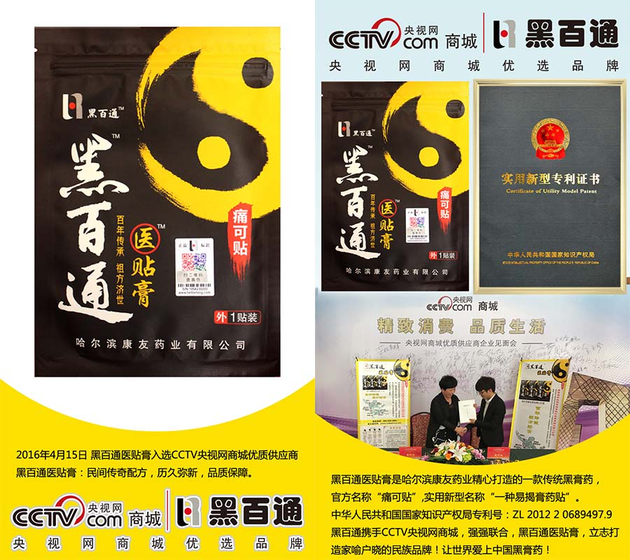 黑百通醫(yī)貼膏,每貼使用6-7天,持續(xù)使用168+小時(shí)。黑百通攜手CCTV央視網(wǎng)商城,強(qiáng)強(qiáng)聯(lián)合,立志打造家喻戶曉的民族品牌,讓世界愛上中國的黑膏藥!