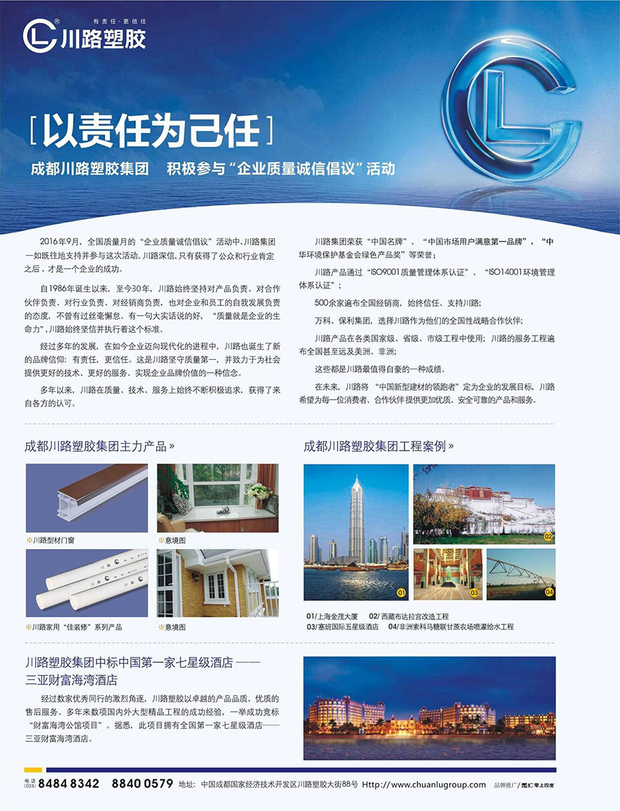 川路塑膠集團(tuán)是四川省高新技術(shù)企業(yè)和政府培育型大企業(yè),是中國(guó)塑料加工工業(yè)協(xié)會(huì)理事及管道分會(huì)副理事長(zhǎng)單位和全國(guó)塑料制品標(biāo)準(zhǔn)化技術(shù)委員會(huì)委員兼SC3副主任委員單位。擁有國(guó)家授權(quán)的博士后科研工作站及數(shù)項(xiàng)國(guó)家產(chǎn)品專利,是四川大學(xué)高分子材料實(shí)驗(yàn)基地,榮獲了中國(guó)名牌、中國(guó)環(huán)境標(biāo)志產(chǎn)品榮譽(yù)稱號(hào),通過(guò)了ISO9001質(zhì)量管理體系認(rèn)證、ISO14001環(huán)境管理體系認(rèn)證、GB/T28001-2001職業(yè)健康管理體系等認(rèn)證,被評(píng)為中國(guó)市場(chǎng)用戶滿意第一品牌及中國(guó)管材管件業(yè)最具影響力品牌稱號(hào)。