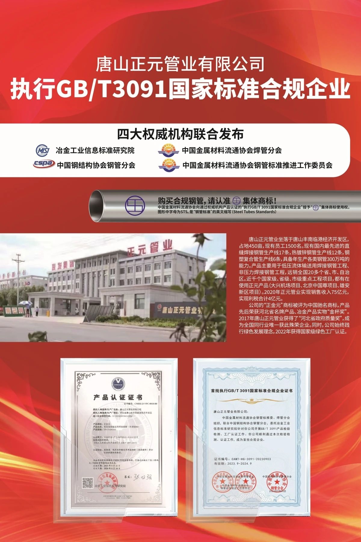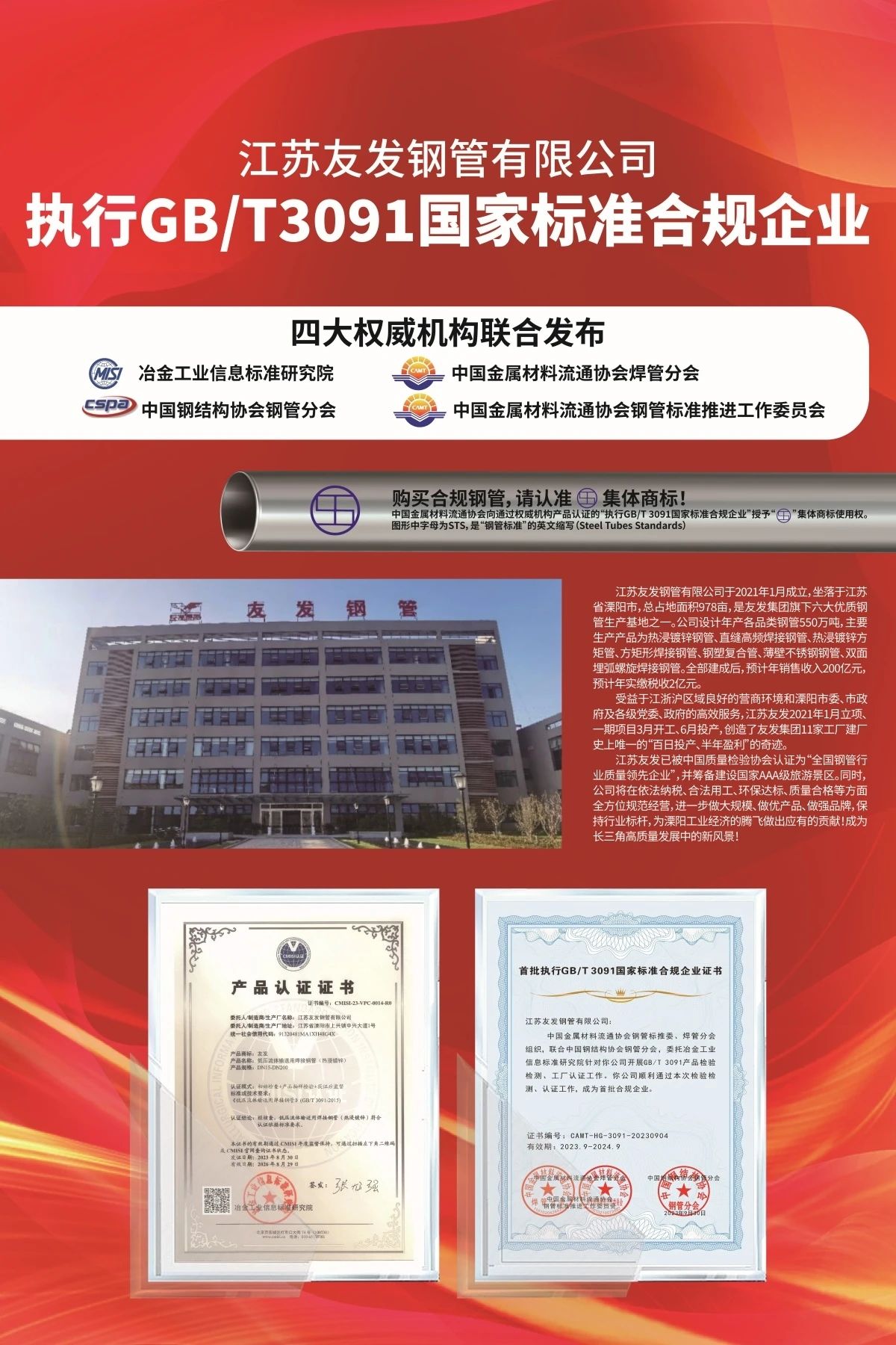 近期,中國(guó)金屬材料流通協(xié)會(huì)已經(jīng)向執(zhí)行標(biāo)準(zhǔn)合規(guī)企業(yè)授權(quán)使用 “STS(鋼管標(biāo)準(zhǔn))”集體商標(biāo)。友發(fā)集團(tuán)率先垂范,在集團(tuán)5家分子公司相關(guān)產(chǎn)品上集中加裝新的集體商標(biāo),充分發(fā)揮行業(yè)龍頭企業(yè)的“頭雁效應(yīng)”,引領(lǐng)行業(yè)規(guī)范化、健康化高質(zhì)量發(fā)展。