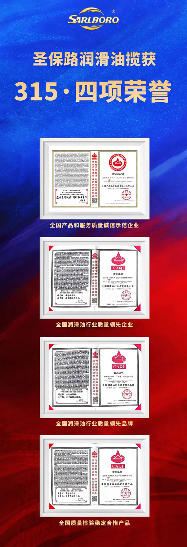 在“3·15”國際消費(fèi)者權(quán)益日到來之際,圣保路再度榮獲中國質(zhì)量檢驗(yàn)協(xié)會(huì)頒發(fā)的2023年“全國產(chǎn)品和服務(wù)質(zhì)量誠信示范企業(yè)”、“全國潤滑油行業(yè)質(zhì)量領(lǐng)先企業(yè)”、“全國潤滑油行業(yè)質(zhì)量領(lǐng)先品牌”、“全國質(zhì)量檢驗(yàn)穩(wěn)定合格產(chǎn)品”四項(xiàng)榮譽(yù)稱號。