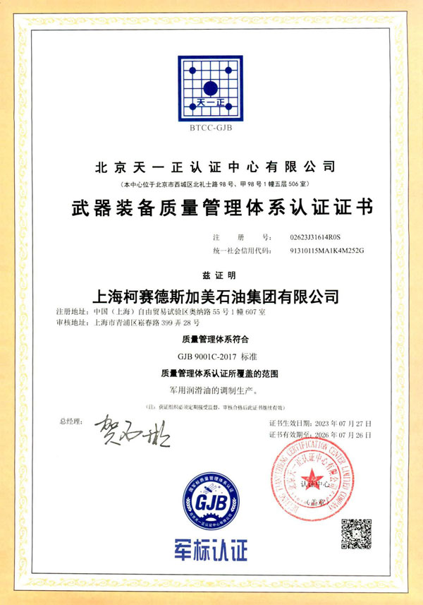柯賽德斯加美石油集團取得軍標認證