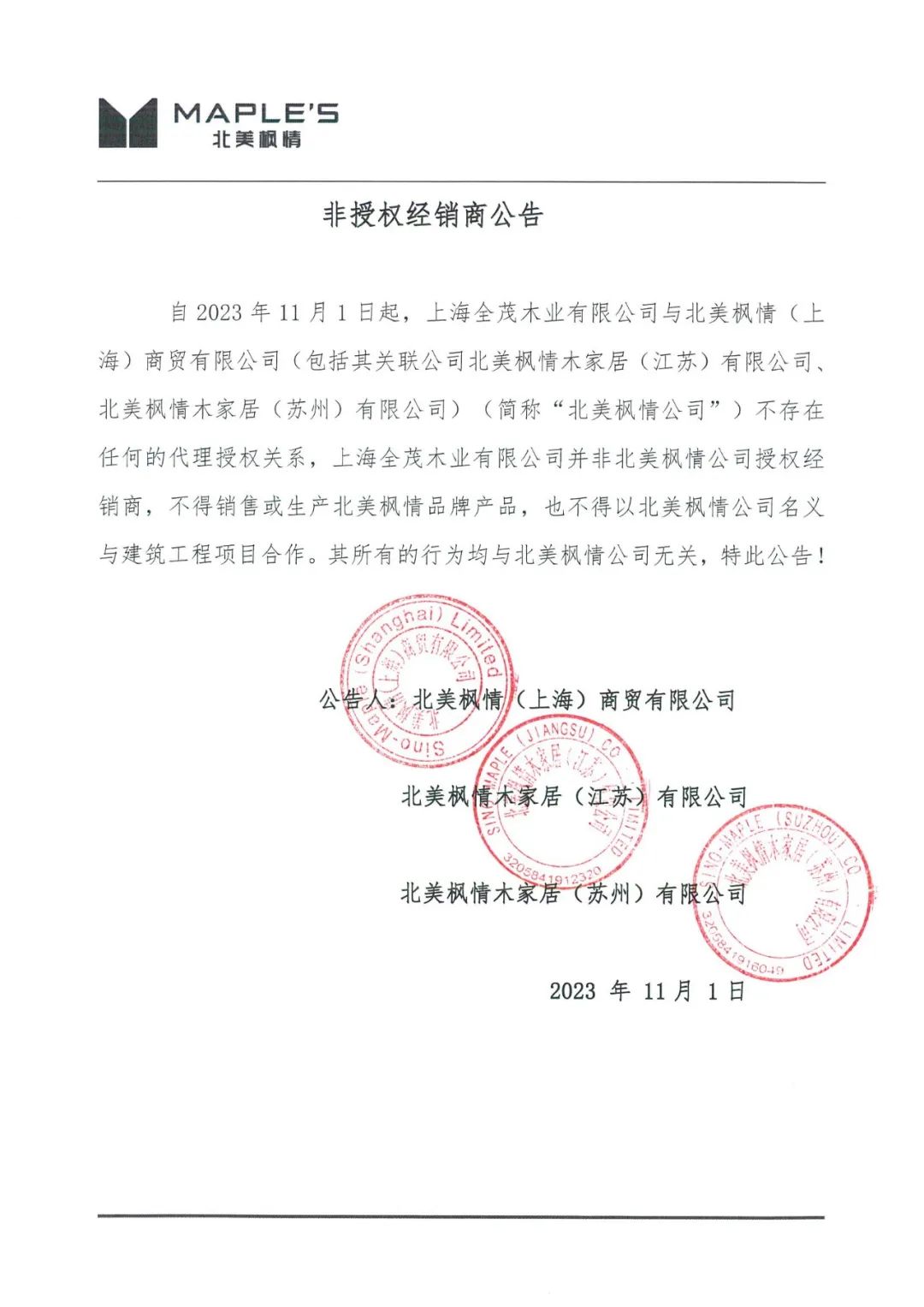 自2023年11月1日起,上海全茂木業(yè)有限公司與北美楓情 (上海)商貿(mào)有限公司(包括其關(guān)聯(lián)公司北美楓情木家居(江蘇)有限公司、北美楓情木家居(蘇州)有限公司)(《簡稱“北美楓情公司”)不存在任何的代理授權(quán)關(guān)系,上海全茂木業(yè)有限公司并非北美楓情公司授權(quán)經(jīng)銷商,不得銷售或生產(chǎn)北美楓情品牌產(chǎn)品,也不得以北美楓情公司名義與建筑工程項目合作。其所有的行為均與北美楓情公司無關(guān),特此公告!
