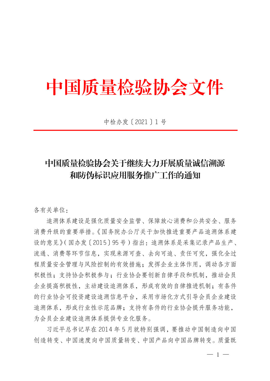 中國(guó)質(zhì)量檢驗(yàn)協(xié)會(huì)關(guān)于繼續(xù)大力開(kāi)展質(zhì)量誠(chéng)信溯源
