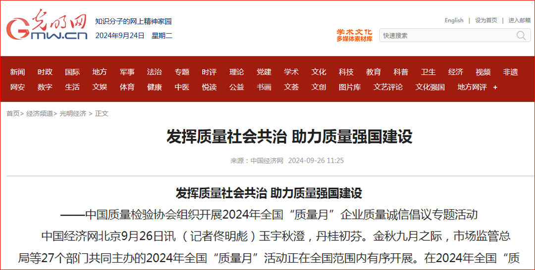 - 中國質(zhì)量報(bào)—堅(jiān)持質(zhì)量第一推動(dòng)質(zhì)量社會(huì)共治 助力質(zhì)量強(qiáng)國建設(shè)——中國質(zhì)量檢驗(yàn)協(xié)會(huì)組織開展2024年全國“質(zhì)量月” 企業(yè)質(zhì)量誠信倡議專題活動(dòng)