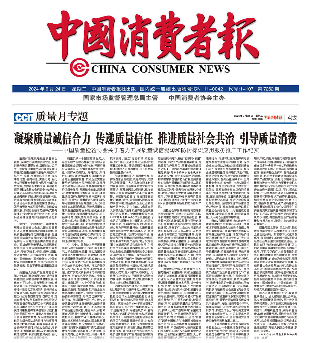 - 中國消費(fèi)者報(bào)—凝聚質(zhì)量誠信合力 傳遞質(zhì)量信任 推進(jìn)質(zhì)量社會(huì)共治 引導(dǎo)質(zhì)量消費(fèi)——中國質(zhì)量檢驗(yàn)協(xié)會(huì)關(guān)于著力開展質(zhì)量誠信溯源和防偽標(biāo)識(shí)應(yīng)用服務(wù)推廣工作紀(jì)實(shí)