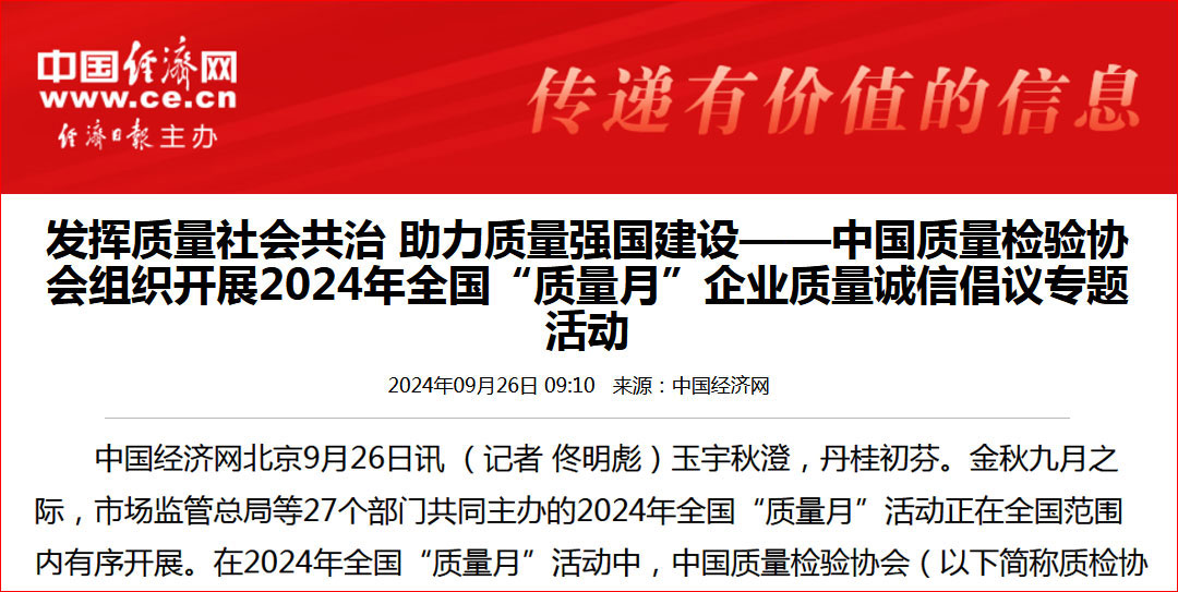 - 中國經(jīng)濟(jì)網(wǎng)—全國“質(zhì)量月”千家企業(yè)倡議:共筑質(zhì)量誠信 建設(shè)質(zhì)量強(qiáng)國——中國質(zhì)量檢驗(yàn)協(xié)會(huì)組織開展2024年全國“質(zhì)量月”企業(yè)質(zhì)量誠信倡議活動(dòng)