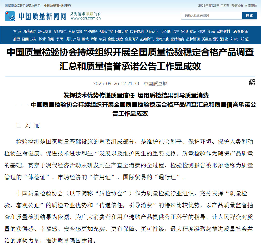 - 中央廣播電視總臺(tái)央廣網(wǎng)報(bào)道——中國質(zhì)量檢驗(yàn)協(xié)會(huì)組織開展2025年全國“質(zhì)量月”企業(yè)質(zhì)量誠信倡議活動(dòng)